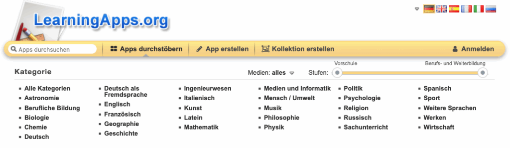 Zum Ausprobieren und Entdecken kann man zunächst einfach auf der Website LearningApps.org stöbern. Eine übersichtliche Suchmaske ermöglicht es, frei oder nach Kategorien bzw. Unterrichtsfächern zu suchen. Über einen Schieberegler lässt sich zudem die Schulart und Klassenstufe eingrenzen.